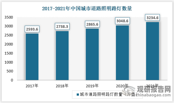 根據住建部統計,中國城市道路照明燈數量在2017年是2593萬盞,2021年增加到3234萬盞,市場總體規模在5500億。