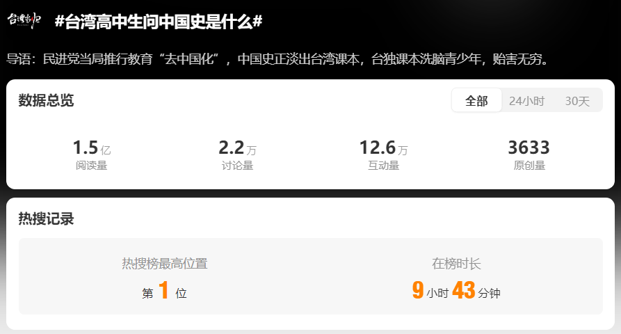 5月30日,@央視新聞 發佈台灣地區“高考”後考生街頭隨採視頻,對台灣高中生提問中國史相關內容,有考生稱中國史就一兩道題,還有考生回答“中國史是什麼”,相關話題登上微博熱搜第一。
