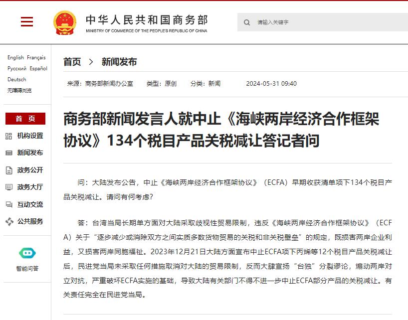 據商務部網站5月31日消息,商務部新聞發言人就中止《海峽兩岸經濟合作框架協議》134個税目產品關税減讓答記者問。