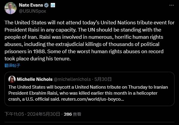 當天早些時候,美國常駐聯合國代表團發言人內特·埃文斯發表聲明稱:“美國將不會以任何身份參加今天在聯合國舉行的悼念萊希總統的活動。”埃文斯指責萊希曾參與“許多可怕的侵犯人權行為,有記錄以來最嚴重的侵犯人權行為發生就在他任職期間”。