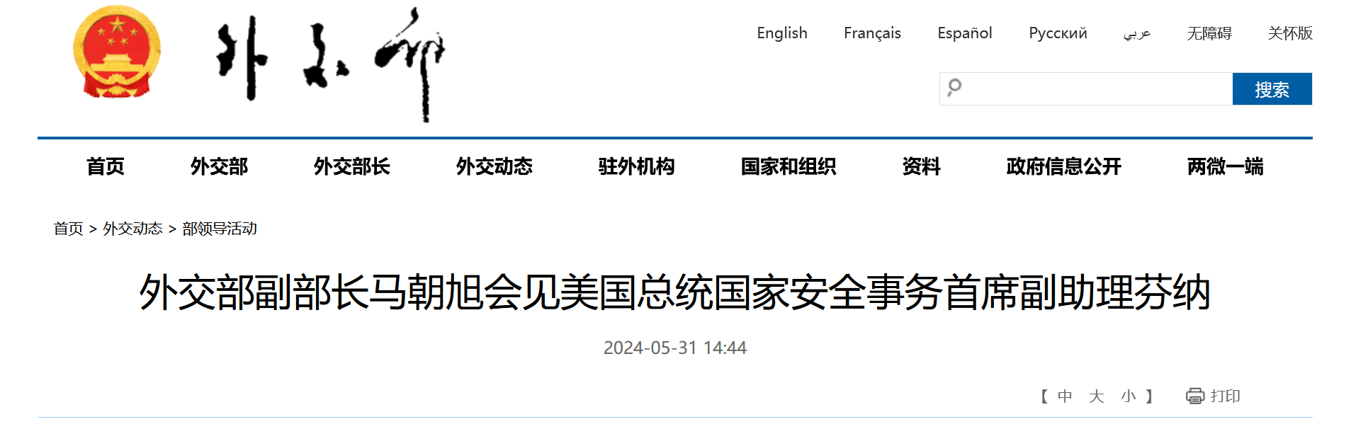 外交部網站消息,當地時間2024年5月30日,外交部副部長馬朝旭在華盛頓同美國總統國家安全事務首席副助理芬納就當前中美關係和共同關心的國際地區問題進行了坦誠、深入、建設性的溝通。