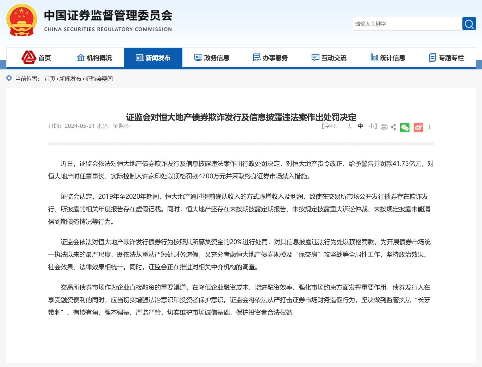 據證監會網站31日消息,近日,證監會依法對恒大地產債券欺詐發行及信息披露違法案作出行政處罰決定,對恒大地產責令改正、給予警告並罰款41.75億元,對恒大地產時任董事長、實際控制人許家印處以頂格罰款4700萬元並採取終身證券市場禁入措施。