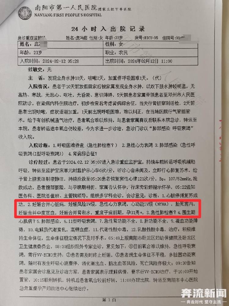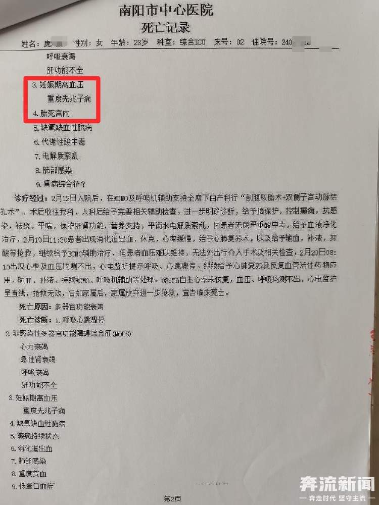 2月12日上午,麗麗被轉運到南陽市中心醫院急危重症孕產婦救治中心,診斷結果和南陽市第一人民醫院一致,立即安排進行剖宮取胎手術。手術後,麗麗一直在昏迷狀態,持續到2月20日死亡。