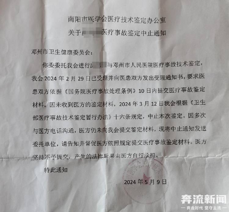 《南陽市醫學會醫療技術鑑定辦公室關於龐**醫療事故鑑定中止通知》説:“我會要求醫患雙方依據《國務院醫療事故處理條例》10日內提交醫療事故鑑定材料。因未收到醫方的鑑定材料,2024年3月12日我會根據《醫療事故技術鑑定暫行辦法》十六條規定,中止本次鑑定。因多次與醫方電話溝通,醫方仍未向我會提交鑑定材料,現將中止通知發送委託單位,請告知並督促醫方依照規定提交醫療事故鑑定材料。”落款時間為2024年5月9日。