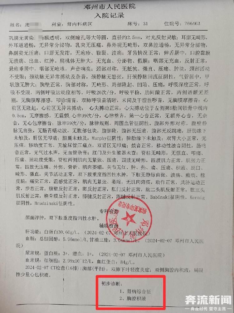 在進行一系列檢查後,麗麗被診斷為腎病綜合徵,入住醫院腎內科治療。鄧州市人民醫院出具的病歷資料顯示:入院診斷為腎病綜合徵、胸腔積液、心包積液、肺炎、貧血。“患者入院後完善相關檢查,給予腎臟穿刺活檢,應用激素、抗凝、保護腎功能、減少尿蛋白、抗感染及對症治療”。多日的查房記錄上,也註明“腎病綜合徵較重”“腎病面容”。