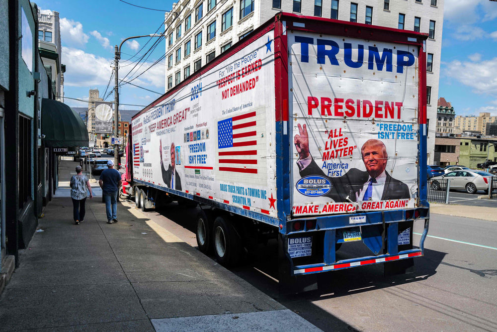 當地時間2024年4月15日,美國賓夕法尼亞州斯克蘭頓,一輛宣傳美國前總統特朗普的拖車停放在街道上。(視覺中國)
