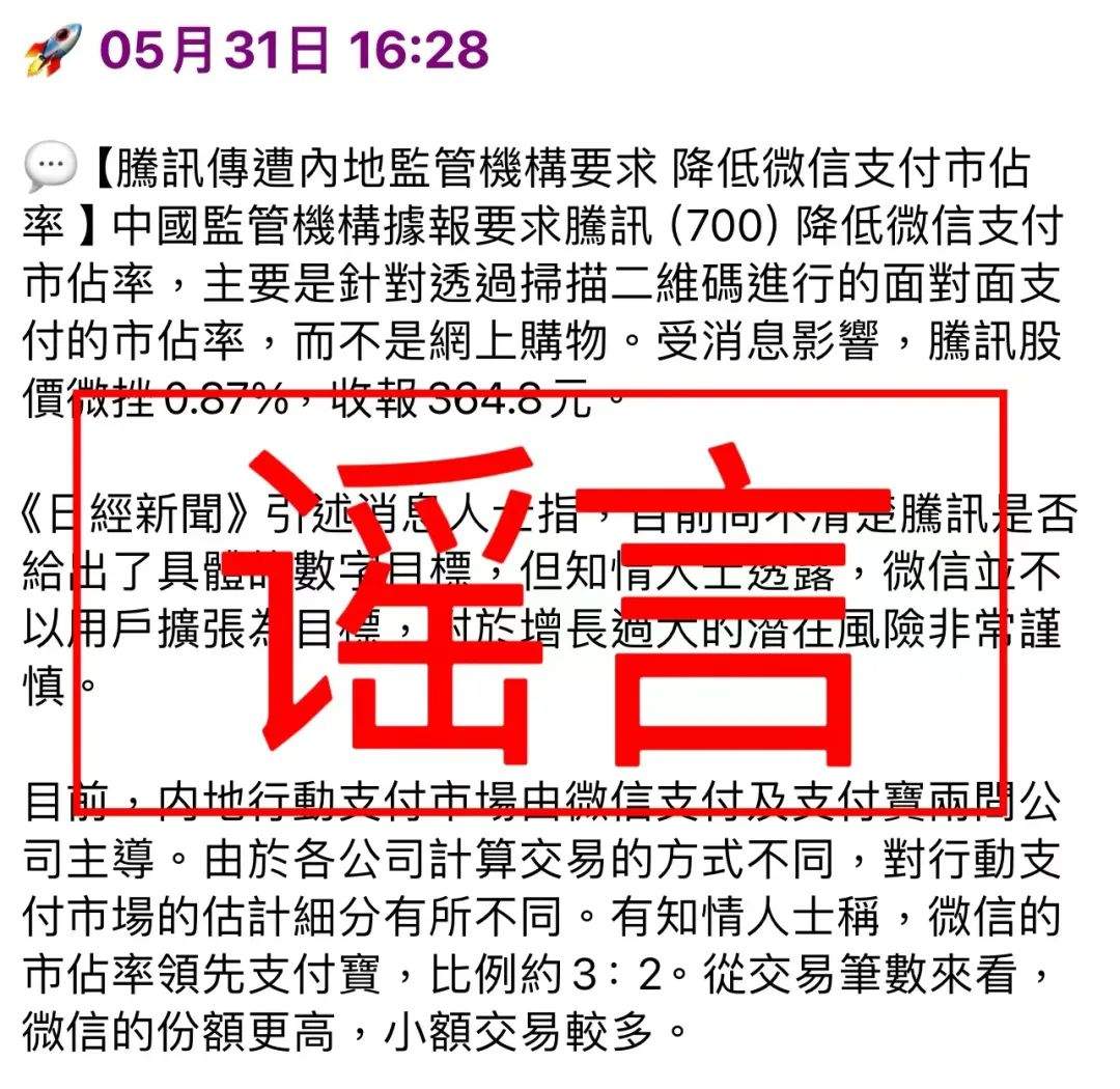 微信支付被要求降低市場份額?官方闢謠 guancha 2024-05-31 針對外媒報道稱“微信支付被要求降低市場份額”,微信官方闢謠平台“謠言過濾器”31日晚發佈消息稱,經確認,相關傳聞不實,純屬謠言。