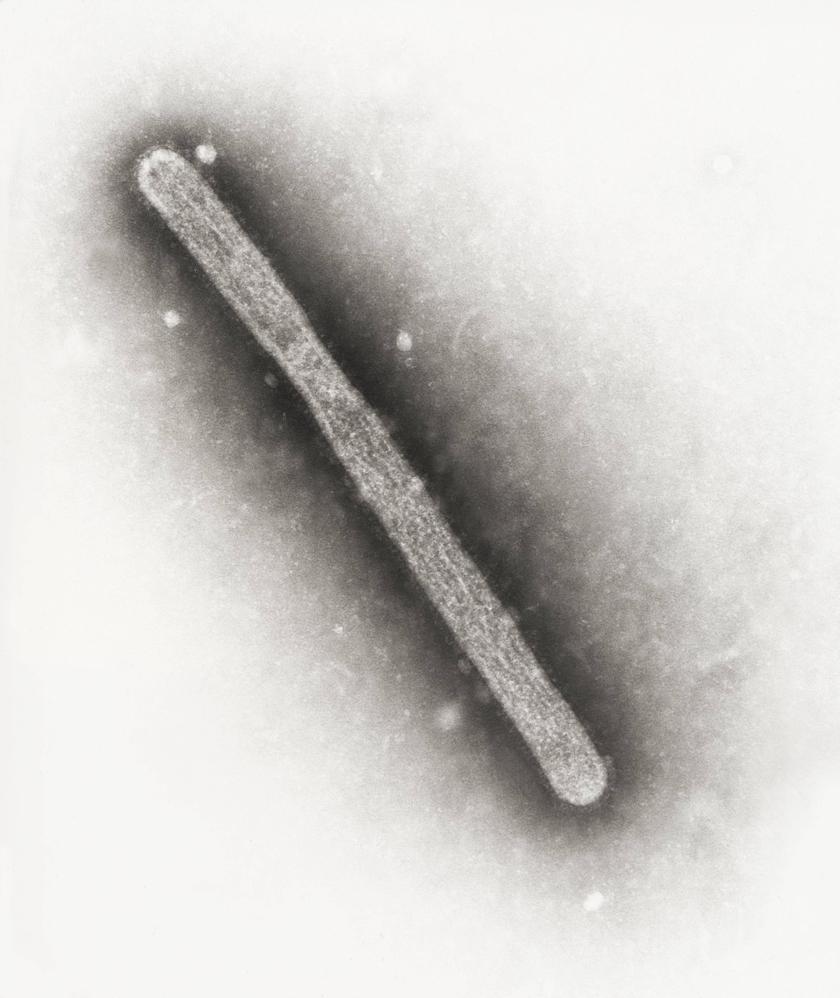 放大15萬倍的甲型H5N1禽流感病毒。2024年5月22日,根據當地衞生官員報告,美國密歇根州已經確認該州第二例人感染禽流感的病例,感染者為一名農場工人,有輕微症狀、感染後很快恢復。(視覺中國)