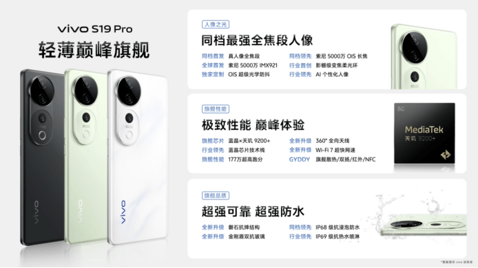 5月30日,vivo發佈vivo S19系列新品。vivo S19 Pro同檔首發全焦段人像,與索尼聯合研發IMX921傳感器搭配影棚級變焦柔光環以及全自研核心算法,帶來專為人像優化的五大黃金焦段;延續S東方美學設計,vivo S19系列還原東方美學獨有的神韻之美,推出煙雨青、桃花扇、千山翠、松煙墨、劍影灰五款配色。