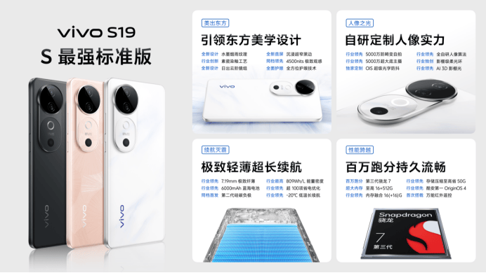 此外,vivo S19系列全系超薄藍海電池,配合自研AI藍心大模型、百萬跑分旗艦芯、4500nits 120Hz護眼屏等功能,全面向旗艦看齊。
