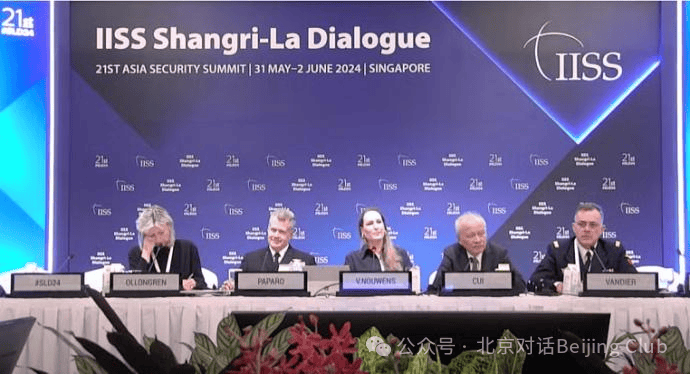 5月31日,外交部前副部長、前駐美大使崔天凱應邀出席第21屆香格里拉對話會“在亞太的威懾與保證”(Deterrence and Reassurance in the Asia-Pacific)特別會議環節,與美國海軍上將、印太司令部司令帕帕羅(Samuel Paparo),荷蘭國防部長奧隆格倫(Kajsa Ollongren),法國國防副參謀長、海軍上將旺迪耶(Pierre Vandier)一起討論,並回答現場嘉賓提問。