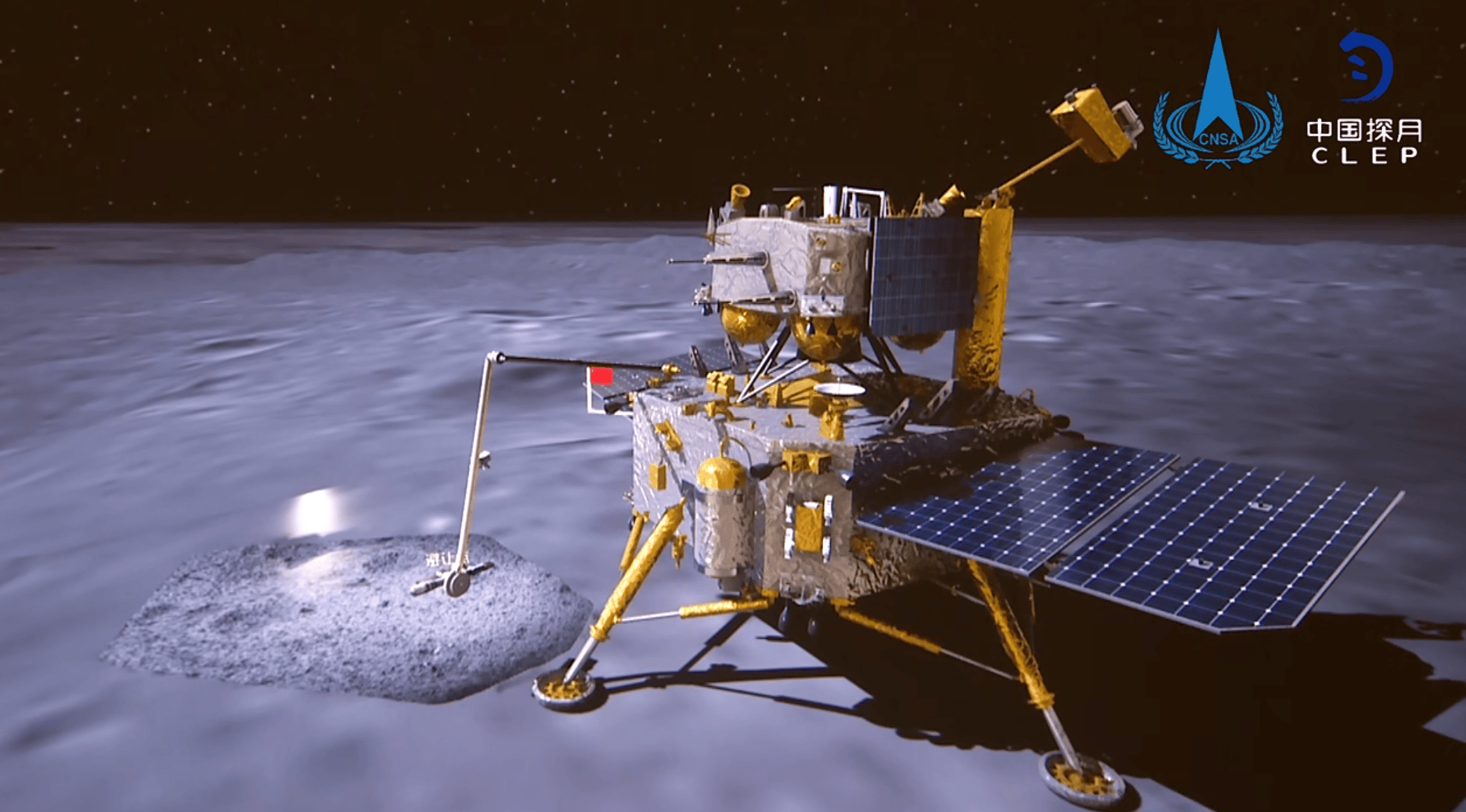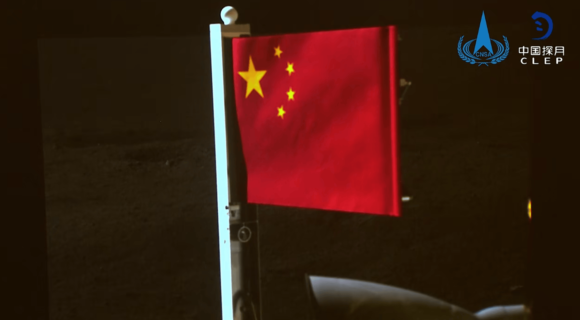 表取完成後,嫦娥六號着陸器攜帶的五星紅旗在月球背面成功展開。這是中國首次在月球背面獨立動態展示國旗。該國旗由新型複合材料和特殊工藝製作而成。由於落月位置不同,嫦娥六號國旗展示系統在嫦娥五號任務基礎上進行了適應性改進。