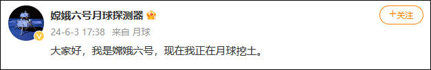 嫦娥六號發動態:我正在月球挖土 guancha 2024-06-04 6月2日,嫦娥六號成功着陸在月球背面南極-艾特肯盆地預選着陸區,開始人類首次月背採樣。 6月3日,@嫦娥六號月球探測器 發佈消息:“大家好,我是嫦娥六號,現在我正在月球挖土。 ”