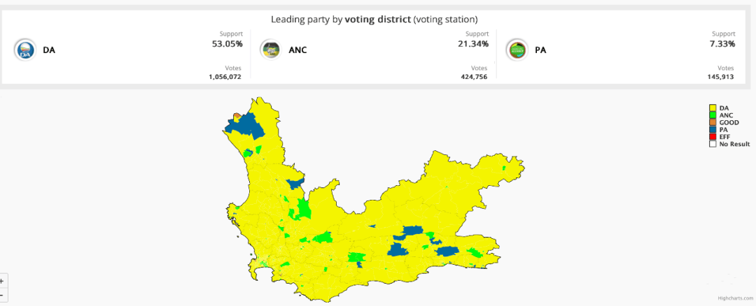 這幾大羣體加上少量對非國大失望的黑人,構成了民主聯盟20%的全國基本盤,也是該黨歷次大選難以突破的門檻上限。就地域分佈而言,西開普省是南非唯一一個黑人不佔人口多數的省份,也是民主聯盟唯一長期穩定執政的省份(包括南非立法首都開普敦),更是近年來部分人炒作的“開普獨立運動”大本營。本次大選中,民主聯盟30%的選票來自該省(超過105萬)。