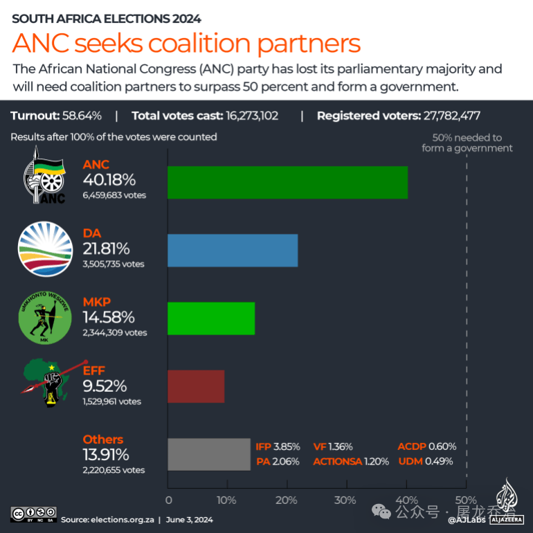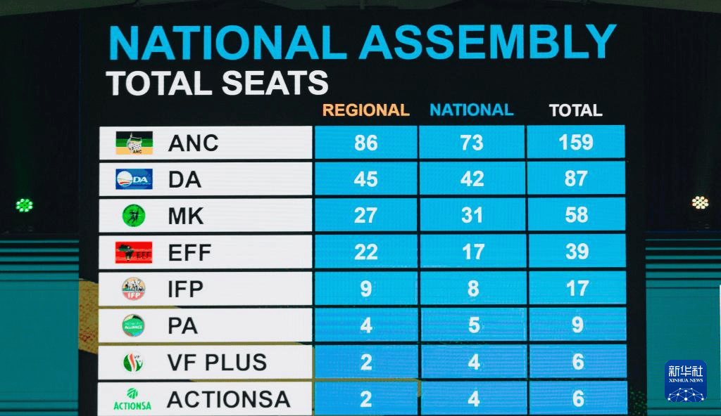 從選舉結果來看,長期穩定執政的“非洲人國民大會”(非國大&ANC)得票率首次跌破50%以下,史無前例地喪失議會絕對多數地位,將不得不其它政黨共享權力、組建聯合政府。相比之下,前總統祖馬支持的新政黨“民族之矛”(MK)一鳴驚人,一躍成為第三大黨。