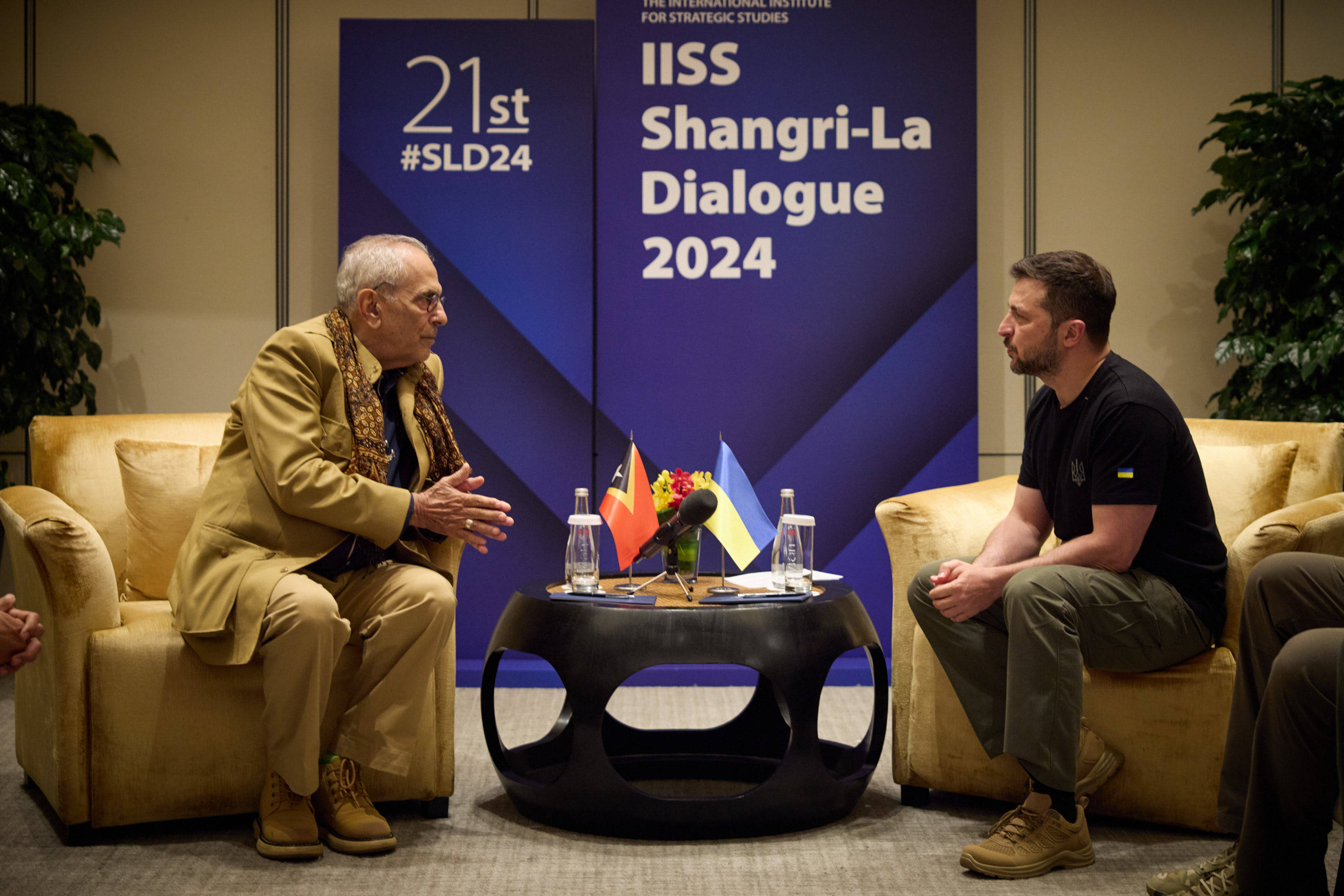 烏克蘭總統澤連斯基與東帝汶總統奧爾塔(左)在新加坡會面。(澤連斯基X賬號)