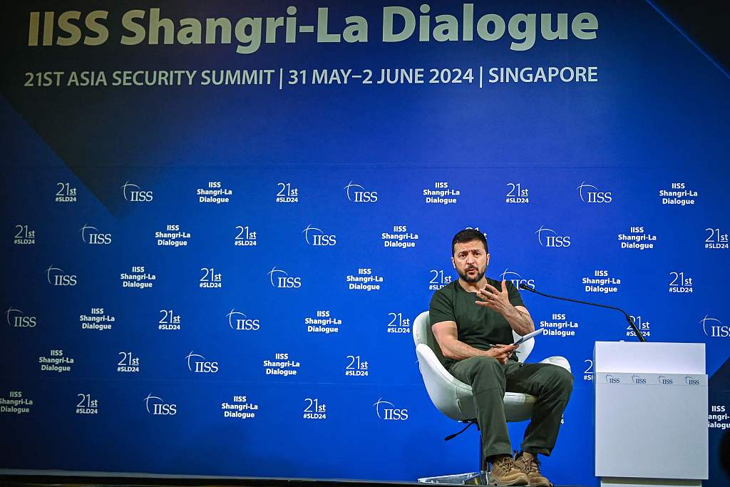 當地時間2024年6月2日,新加坡,烏克蘭總統澤連斯基在第21屆香格里拉對話會上發表演講。(視覺中國)