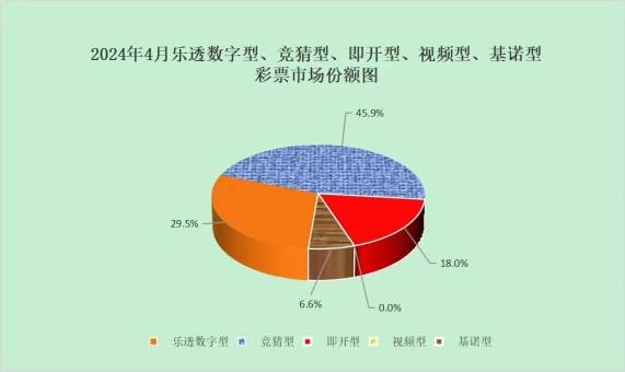 1-4月累計,樂透數字型彩票銷售592.63億元,同比增加54.31億元,增長10.1%;競猜型彩票銷售834.09億元,同比增加19.75億元,增長2.4%;即開型彩票銷售489.56億元,同比增加185.29億元,增長60.9%;基諾型彩票銷售132.95億元,同比增加38.38億元,增長40.6%。1-4月,樂透數字型、競猜型、即開型、基諾型彩票銷售量分別佔彩票銷售總量的28.9%、40.7%、23.9%、6.5%。視頻型彩票銷售0.0047億元,同比增加0.0017億元。