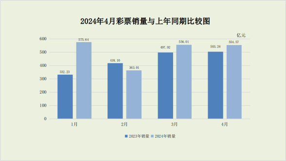 1-4月累計,全國共銷售彩票2049.23億元,同比增加297.73億元,增長17.0%。其中,福利彩票機構銷售699.62億元,同比增加145.68億元,增長26.3%;體育彩票機構銷售1349.61億元,同比增加152.05億元,增長12.7%。