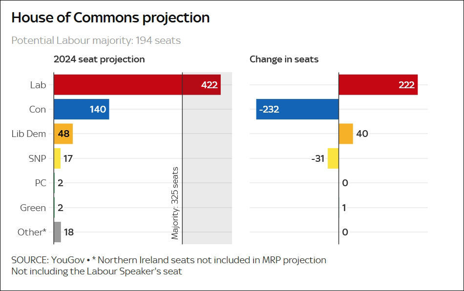 根據輿觀調查公司3日發佈的民調結果,在英國議會下院650個議席中,工黨有望拿下422席,與2019年上一次大選結果相比增加了222個席位。執政的保守黨則只有140席,驟減232個席位。另一反對黨自由民主黨則由上次大選的8席增至48席。