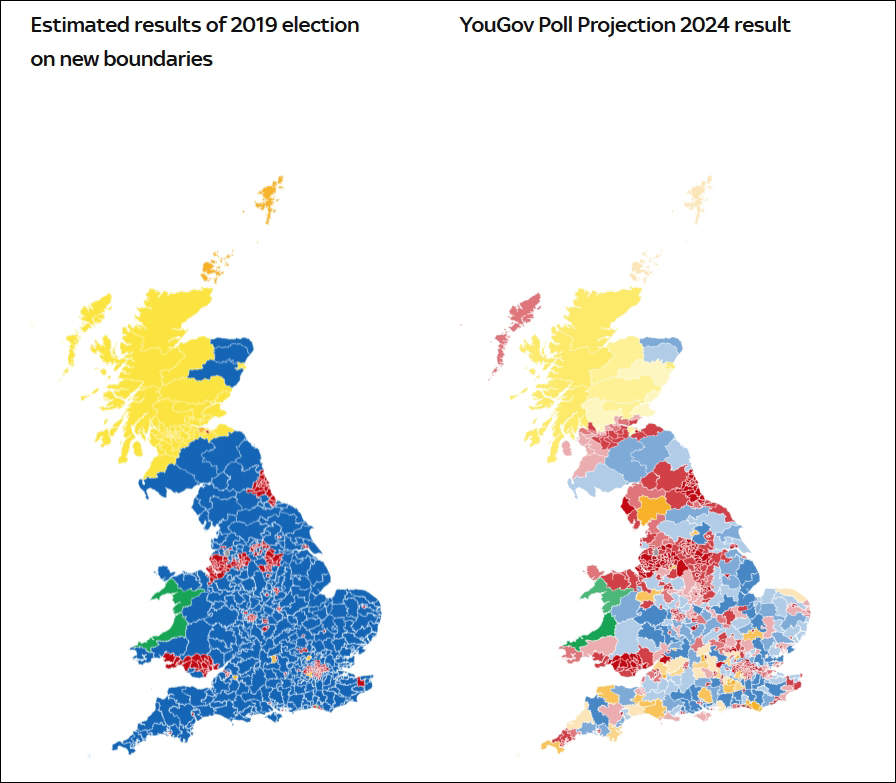 以新劃定選區為標準,2019年大選結果和今年預測結果對比(英國天空新聞)