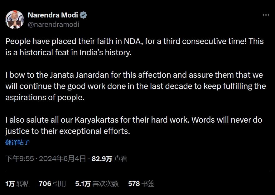【文/觀察者網 阮佳琪】“人們連續第三次對全國民主聯盟(NDA)表達了信任!這是印度歷史上的一個歷史性壯舉。”當地時間6月4日,印度總理莫迪在社交媒體上宣佈勝選。這意味着他開啓第三個總理任期,追平印度開國總理尼赫魯的任期紀錄。
