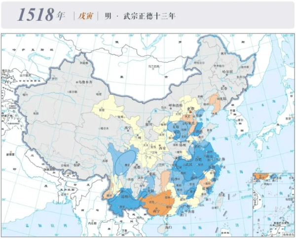 1518年全國出現大面積極端旱澇現象,深橙色為5級旱,深藍色為1級澇
