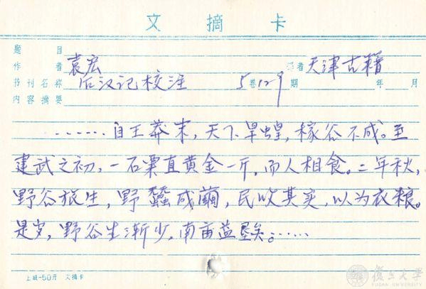 復旦大學史地所老師們手抄的氣候史料卡片,此處記錄了王莽末年的旱災和蝗災,及由此造成的農業欠收和東漢初期百姓饑饉慘狀