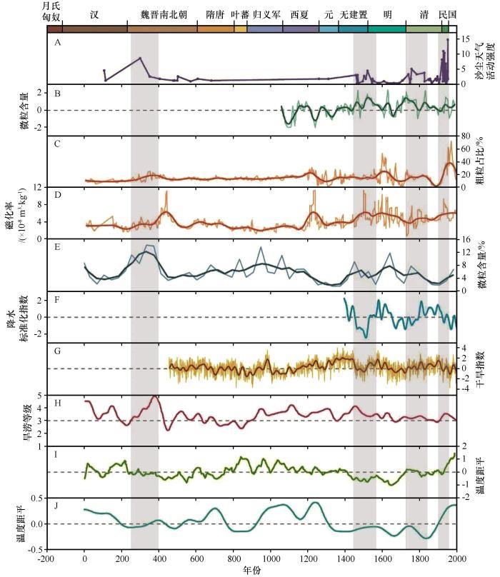 圖2 敦煌歷史時期沙塵天氣活動強度序列(A),敦德冰芯微粒含量(B),蘇幹湖沉積物粗粒含量(C),蘇幹湖沉積物磁化率(D),巴里坤湖沉積物組分含量(E),河西走廊近600年降水序列(F),河西走廊帕爾默乾旱度指數(scPDSI)序列(G),黑河流域近2 000年旱澇序列(H),Yang等重建的中國2 000年温度序列(I),Ge等重建的中國2 000年温度序列(J)