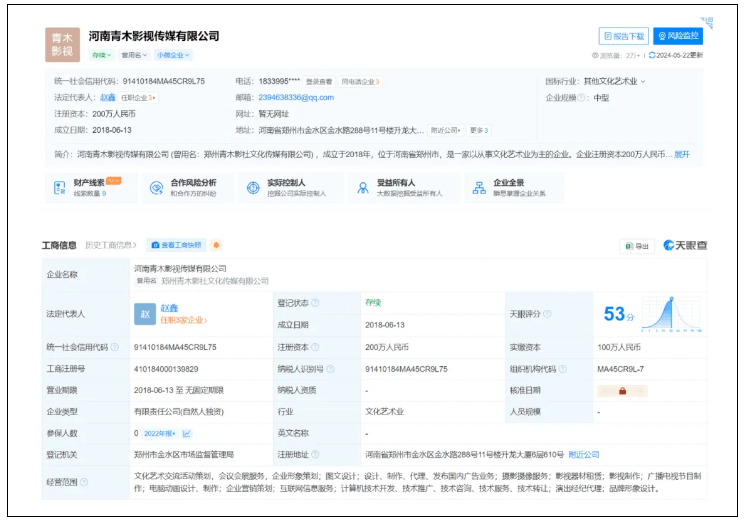 河南青木影視傳媒有限公司成立於2018年6月,註冊資本為200萬。據河南電視台消息,5月20日,河南青木影視傳媒有限公司承製河南廣播電視台都市頻道聯合攝製的81集都市愛情微短劇《煙火愛情》。