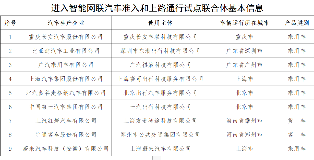 6月4日,工業和信息化部、公安部、住房和城鄉建設部、交通運輸部(以下簡稱四部門)正式發佈,按照《關於開展智能網聯汽車准入和上路通行試點工作的通知》的有關工作安排,我國首批確定由長安、比亞迪、廣汽等9個汽車生產企業和9個使用主體組成進入試點的聯合體,並將在北京、上海、廣州等7個城市展開智能網聯汽車准入和上路通行試點。