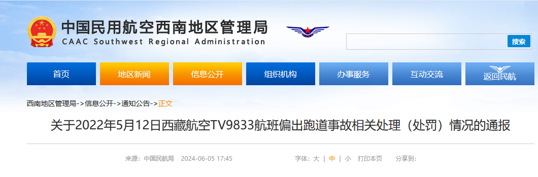 據中國民用航空西南地區管理局網站消息,民航西南局6月5日發佈《關於2022年5月12日西藏航空TV9833航班偏出跑道事故相關處理(處罰)情況的通報》,全文如下:
