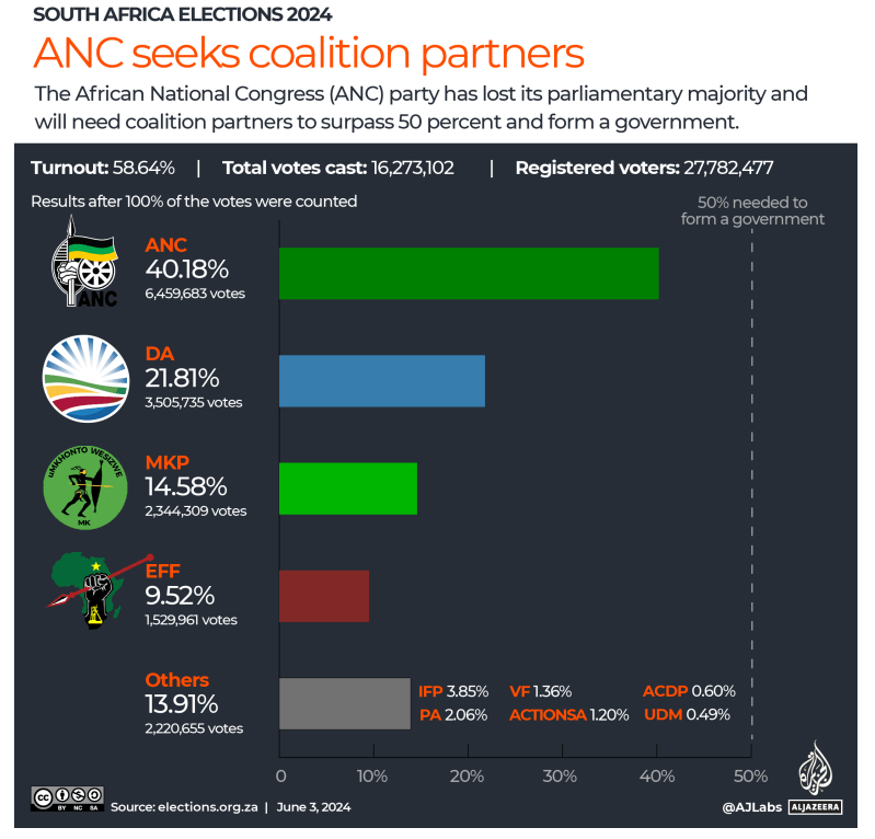 2024年南非選舉,非國大已經失去了議會多數席位,需要聯盟合作伙伴以超過50%的選票並組建政府。 (半島電視台)