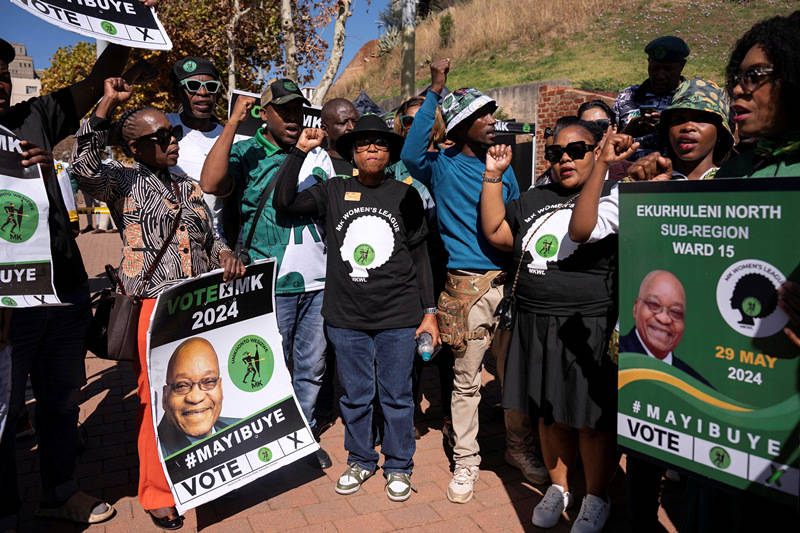 當地時間2024年5月20日,南非約翰內斯堡,南非前總統祖馬的支持者在憲法法院外舉行示威活動。當天,南非最高司法機構南非憲法法院裁定,前總統祖馬因之前的刑事定罪,不得在本月29日的南非大選中作為議會候選人蔘選。(圖片來源:Ihsaan Haffejee/澎湃影像)