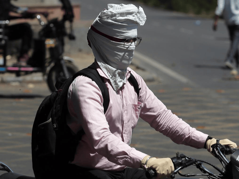 5月27日,在印度北部旁遮普邦阿姆利則地區,一名男子在炎熱的下午騎着自行車,臉上裹着一塊布來防曬。(圖/新華社)