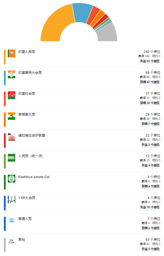 印人黨原定目標是400席,而多數出口民調預測為350席,最終NDA獲得的席位卻僅有293席,相較於2019年的352席有明顯下降。其中,印人黨獨立贏得約240席,未能達到議會多數所需的272席,因此需要依賴友盟如泰盧固之鄉黨、人民黨(聯合)等地方政黨的支持來組閣。友盟的這一地位可能使它們在內閣中擁有更多話語權,並可能在印人黨第三任期中對政府施加影響。