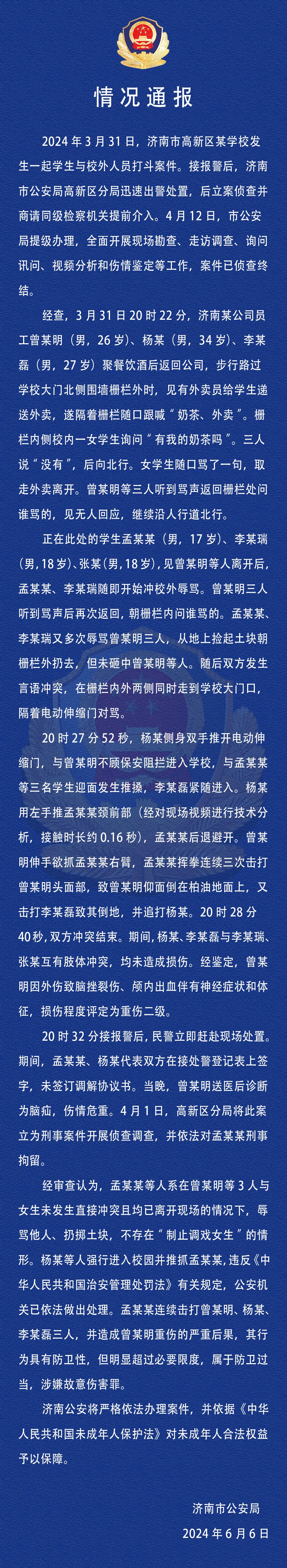 6月6日,山東濟南市公安局公眾號就此前濟南“學生與醉漢衝突被刑拘”一案,發佈情況通報稱,學生孟某某等人不存在“制止調戲女生”的情形,且連續擊打曾某明三人,並造成曾某明重傷的嚴重後果,其行為具有防衞性,但明顯超過必要限度,屬於防衞過當,涉嫌故意傷害罪。