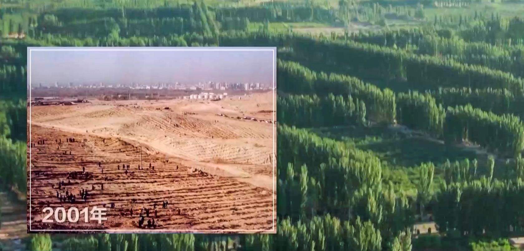 △初夏,新疆阿克蘇柯柯牙鎮,一排排楊樹鬱鬱葱葱。曾經,這裏一年有100天刮沙塵暴,一夜可摧毀萬畝農田。