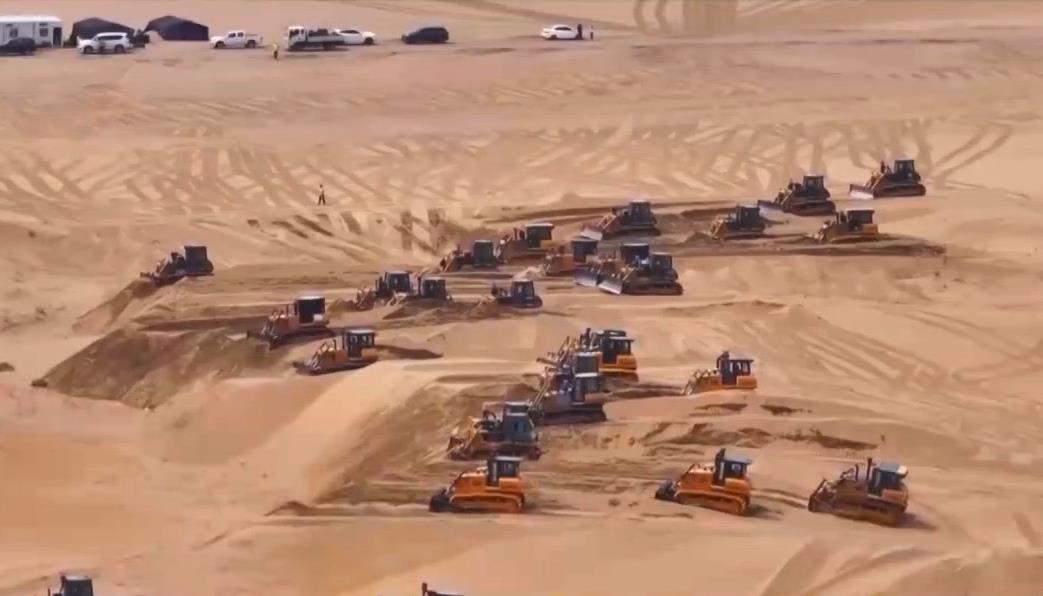 在內蒙古鄂爾多斯的茫茫沙海中,近200台推土機來回穿行,推平高低起伏、連綿不斷的沙丘,以便後續在此安裝光伏板。這正是當下最新的光伏治沙模式中的一個環節。