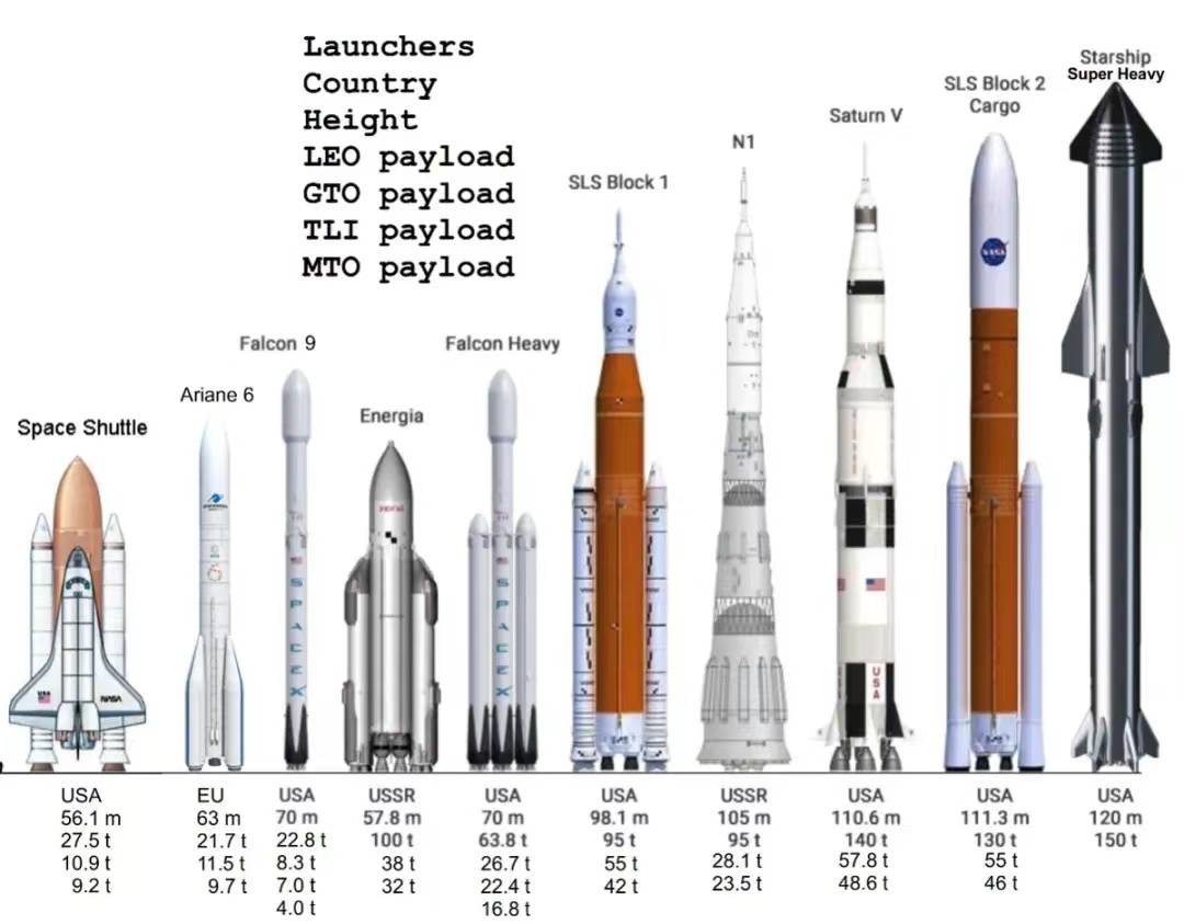 外國網友製作的部分重型火箭對比。最右側為星艦,中間SLS Block 1是當前的SLS火箭,最左側的是航天飛機