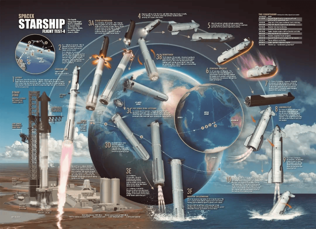 北京時間2024年6月6日晚,由SpaceX(美國太空探索技術公司)研製的星艦超重型火箭在德克薩斯州博卡奇卡進行了第四次飛行,並獲得成功: