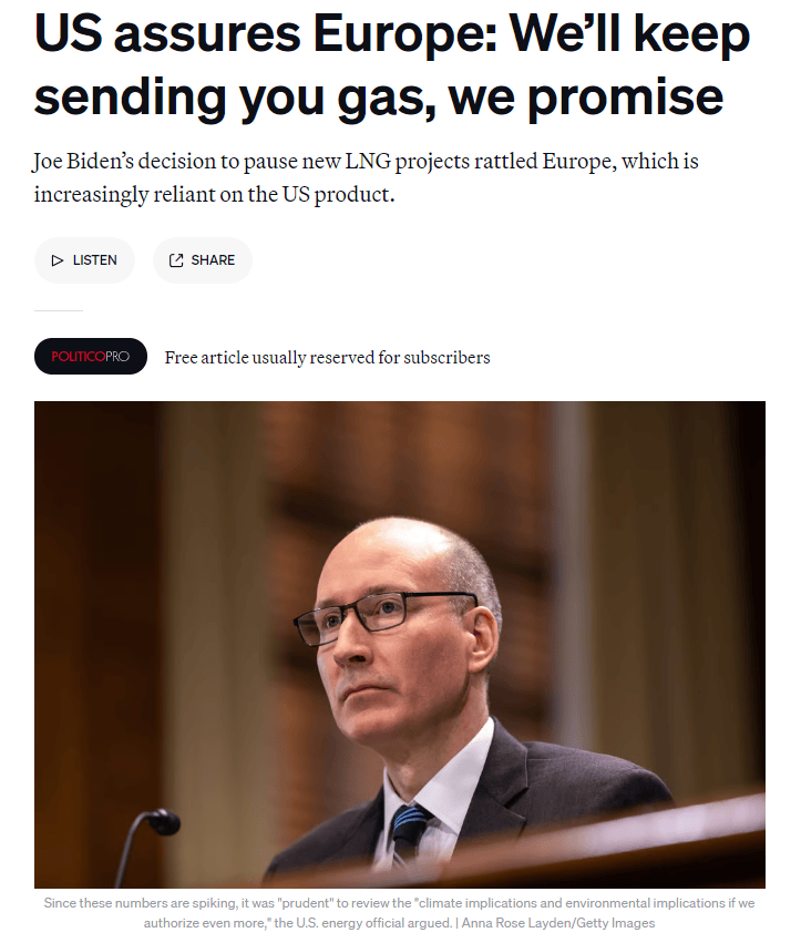 其實也不怪歐洲盟友們心慌,自2017年美國開始出口液化天然氣以來,美國政府從未出現過終止液化天然氣出口合同的先例。何況自俄烏衝突以後,歐洲就面臨能源短缺問題,將美國的天然氣視為能源安全供應的重大戰略性選擇。
