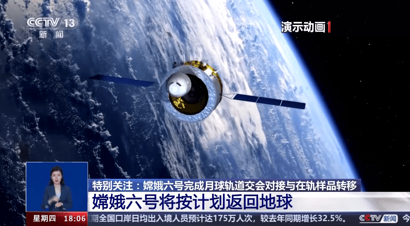 6月6日14時48分,嫦娥六號上升器成功與軌道器和返回器組合體,完成月球軌道的交會對接,並於15時24分將月球樣品容器安全轉移至返回器中。這是我國航天器繼嫦娥五號之後,第二次實現月球軌道交會對接。