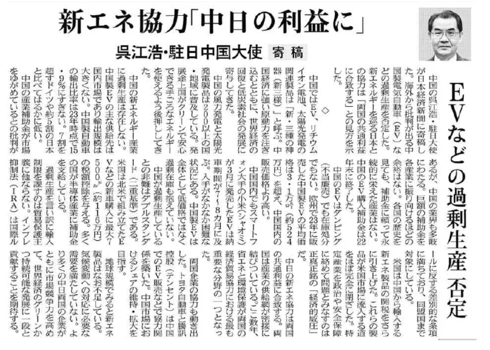 據中國駐日本大使館微信公眾號消息,6月6日,駐日本大使吳江浩在《日本經濟新聞》發表題為《中日開展新能源產業合作符合雙方共同利益》的署名文章,全面宣介中國新能源產業發展,批駁“中國輸出過剩產能”論調,全文如下: