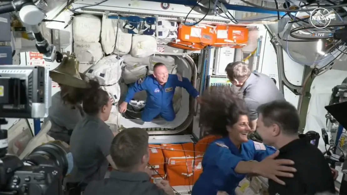 威爾莫爾和威廉姆斯將在空間站停留約8天,他們受到了空間站七名宇航員的熱烈歡迎和擁抱,這九個人將在國際空間站一起工作和生活。