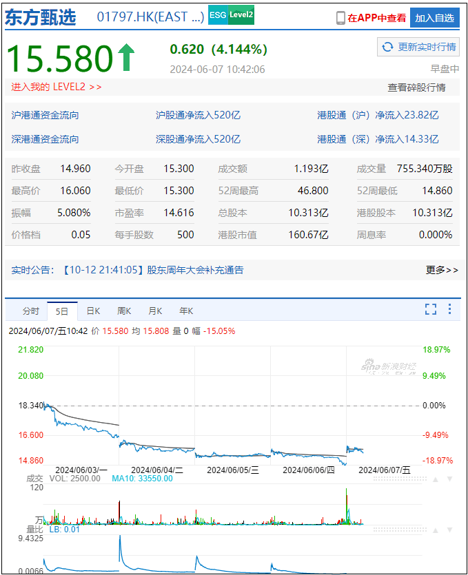7日,在俞敏洪道歉視頻發佈後,東方甄選股價一度回漲7.35%至16.06港元,截至發稿股價上漲4.144%至15.58港元。