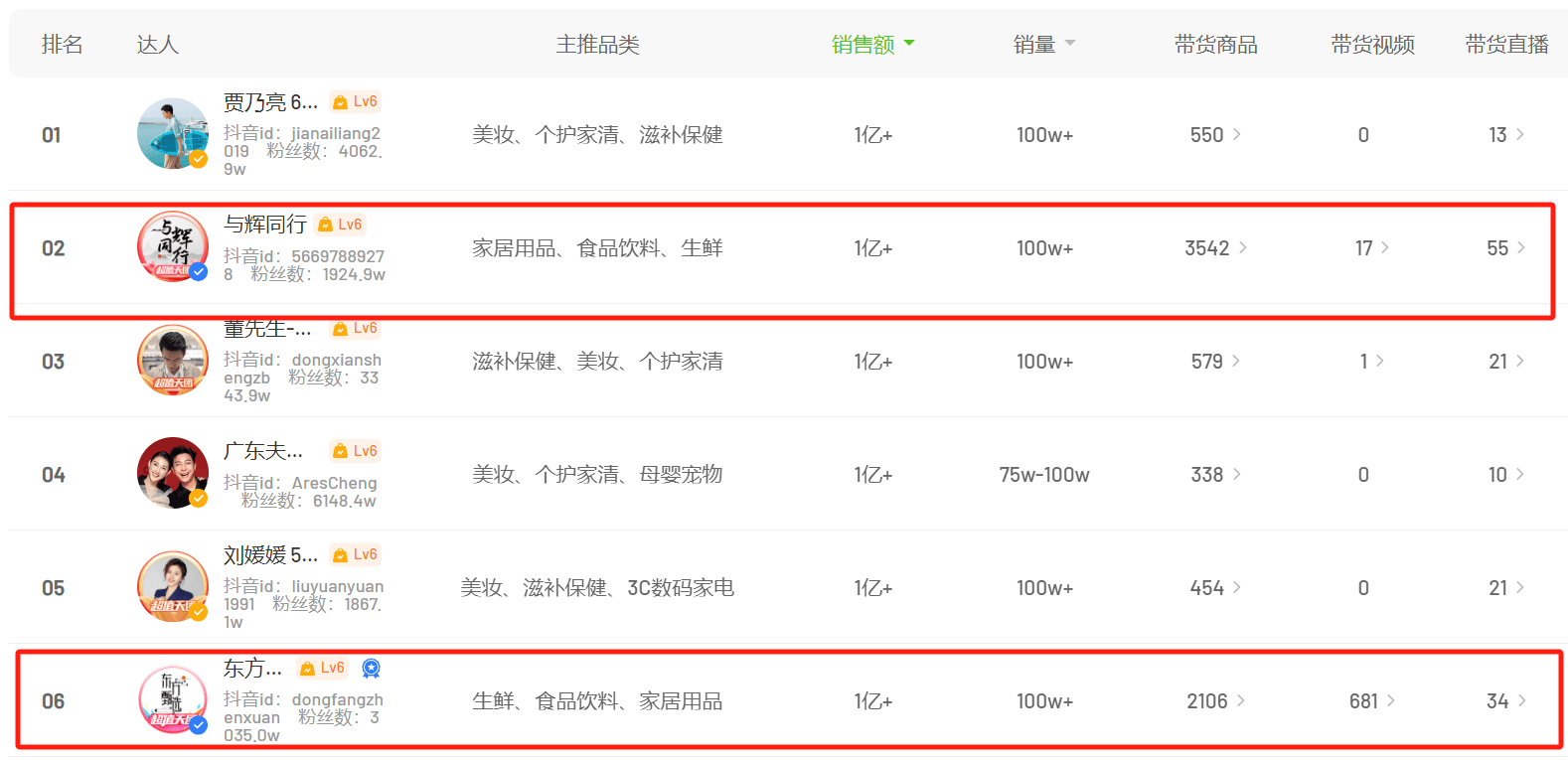 據飛瓜數據,在5月抖音帶貨達人榜中,與輝同行以5.33億元銷售額排名第二,而東方甄選則排名第6。