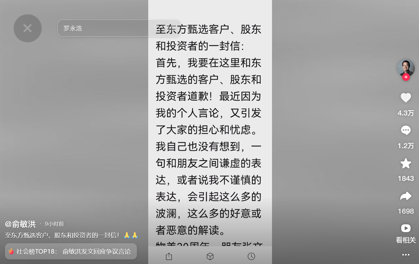 首先,我要在這裏和東方甄選的客户、股東和投資者道歉!最近因為我的個人言論,又引發了大家的擔心和憂慮。我自己也沒有想到,一句和朋友之間謙虛的表達,或者説我不謹慎的表達,會引起這麼多的波瀾,這麼多的好意或惡意的解讀。