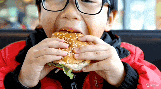 提示詞:一個戴眼鏡的中國男孩在快餐店內閉眼享受美味的芝士漢堡