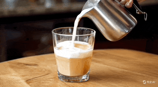 以下是可靈官網展示的一段“一隻手將牛奶從鋼製打奶壺倒入桌上一杯咖啡中,背景為模糊的廚房”的視頻片段。